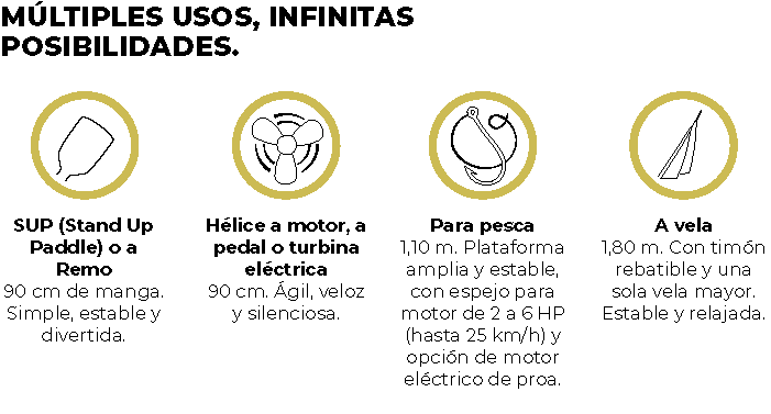 PESO: 35 kg. // MANGA: 0.75 mts. // ESLORA: 4.30 mts. // CARGA MAX.: 165 kg. + carga // USOS: recreativo, pesca, paseo, travesía. // INCLUYE: remo convencional.